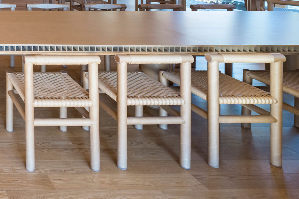 紙管のフレームに梱包用紙テープを編んで弾力のある座面をつくった。