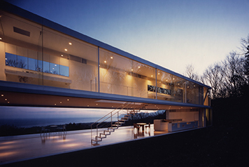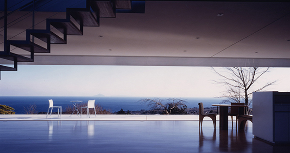 海から続く小高い丘のほぼ頂上に位置する敷地にはじめて立ったとき、建築自体をピクチャー・ウインドウとみなし、水平に広がる景色を切り取り、さらには海からの景色の流れを建築が仕切ってしまわずに、裏の雑木林に連続させていくことを考えた。そこで2階全体を梁せいとした20メートルスパンのトラスを構成し、1階を20mx2.5mのピクチャーウインドウとしている。