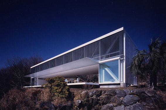immediate response was to frame the wonderful view of the ocean stretching horizontally. That is to say that the building itself should become a picture window. Also, to prevent the architecture from becoming an obstacle disrupting the natural sense of flow from the ocean, I've thought of maintaining that continuity by passing it through the building up to the woods at the top