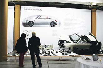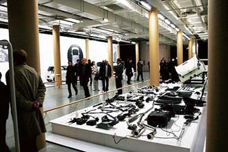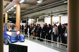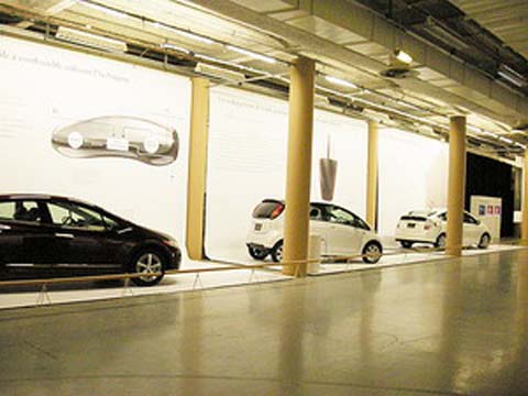 This was the first exhibition curated by Design Platform Japan, an organization that presents the work of Japanese de sign industries worldwide. The site configuration was done by Shigeru Ban, and it was curated by Kenya Hara, a prominent graphic designer. The exhibition exposed the novel value of Japanese cars in three aspects: smallness, environmental efficiency, and mobile urban cells, introducing the historic and cultural background of Japanese industry. In the main hall are the vehicles, all in white and shown in an environment that has come to define the minimalistic approach. The paper tube columns provide the frame for the vehicles.