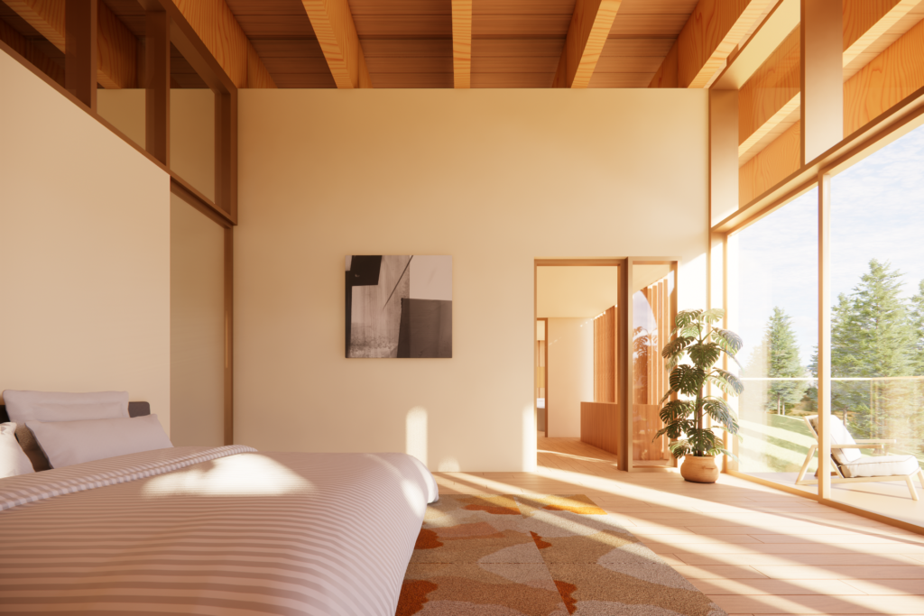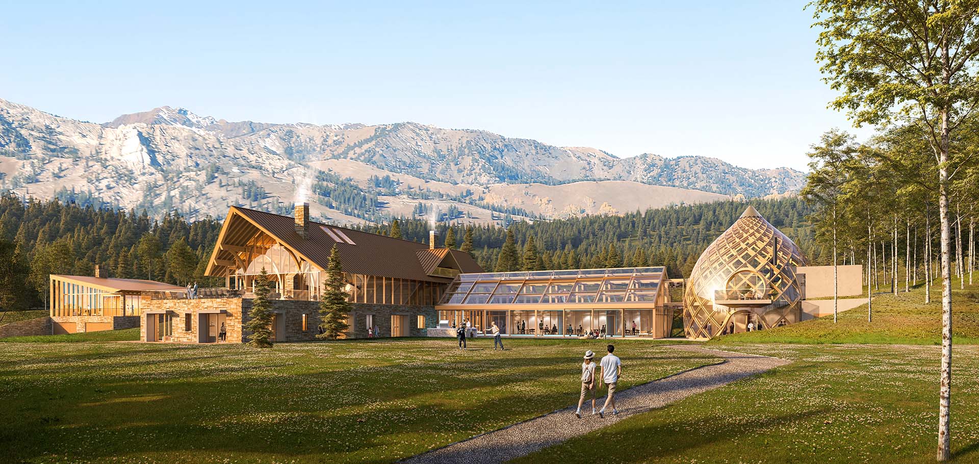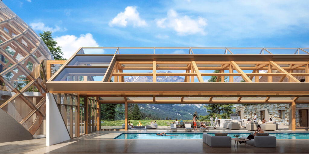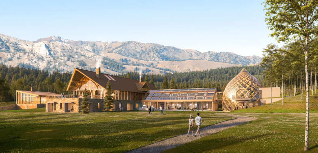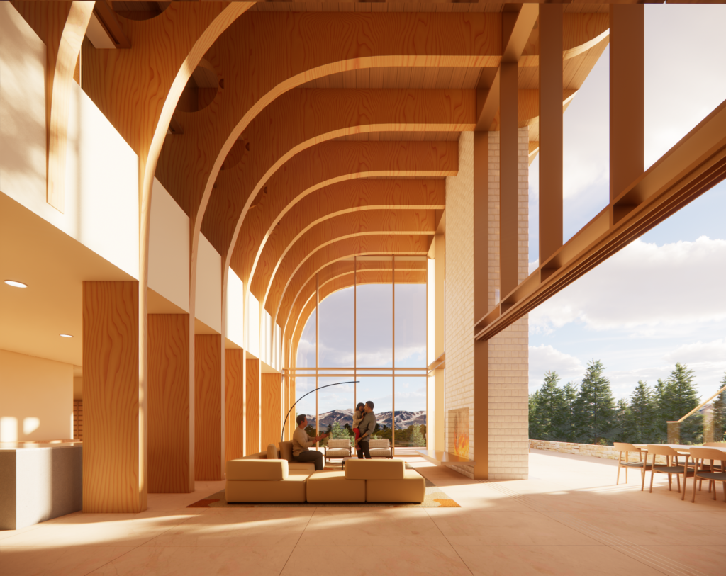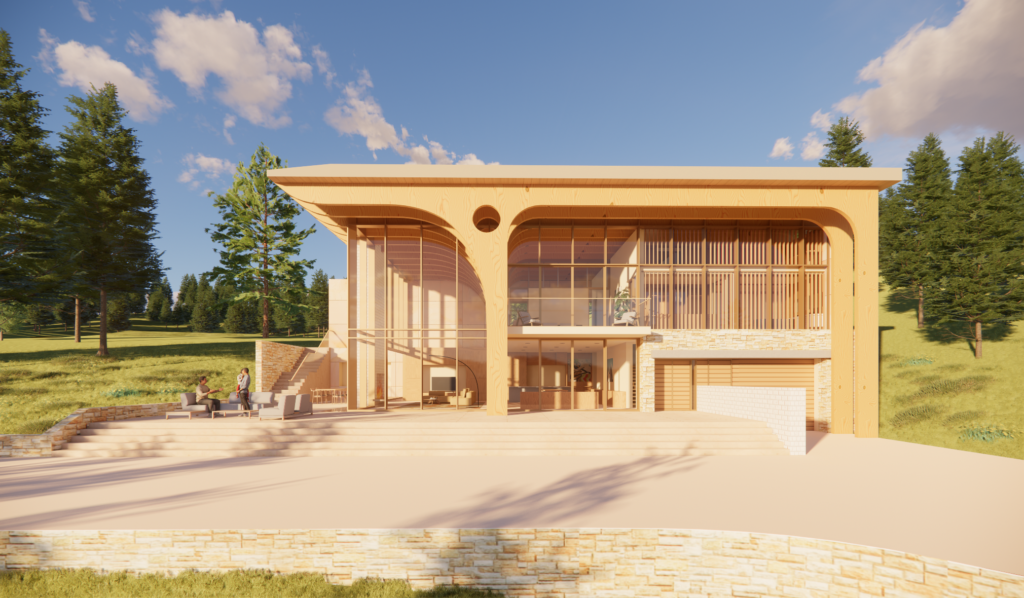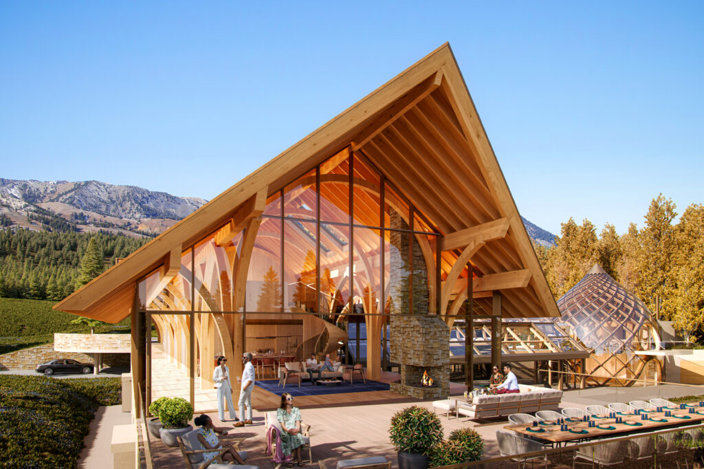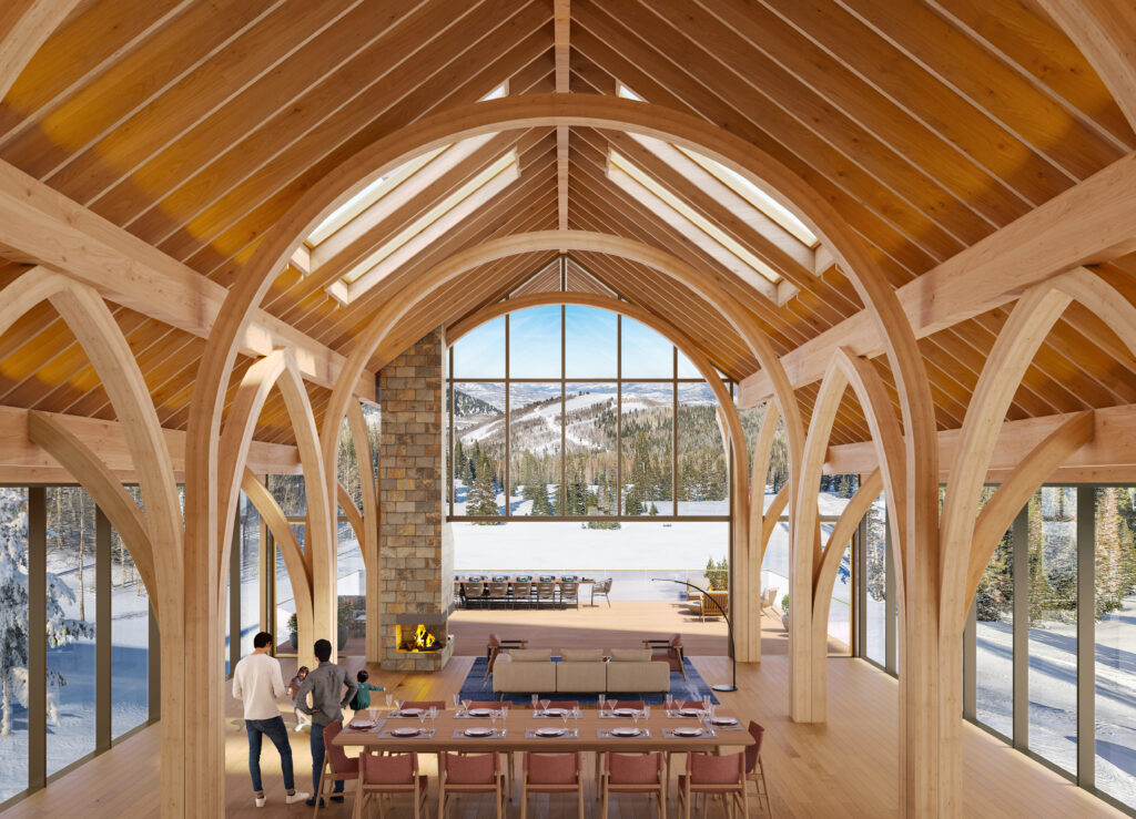 This 7-acre hilltop property in Park City features mountain views and dense conifer and aspen surroundings. The concept was to develop a vernacular architecture with unique and distinctive mass timber structures. The project consists of three independent Buildings: Main House, Guest House, and Party Barn. The Main House combines a Main Residence, a Pool House, and an Event Pavilion. The Main Residence structure is a series of glulam treelike elements that create arches in two directions, offering extensive living and recreational spaces. The Pool House consists of glulam post and beam gable structure forming a bridge that connects the Main Residence to the Event Pavilion. The Event Pavilion comprises of overlapping curved glulam that form a spiraling truss. The Guest House is a multi-level cantilevered structure, while the Party Barn offers a place for horses, guest apartment, and utility storage.