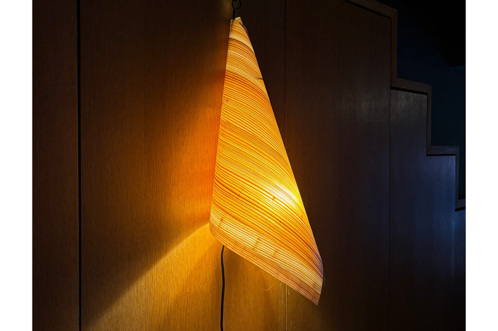 An assembly-style lamp made from rolled cedar veneer, sourced from Hita City in Oita Prefecture, Japan.